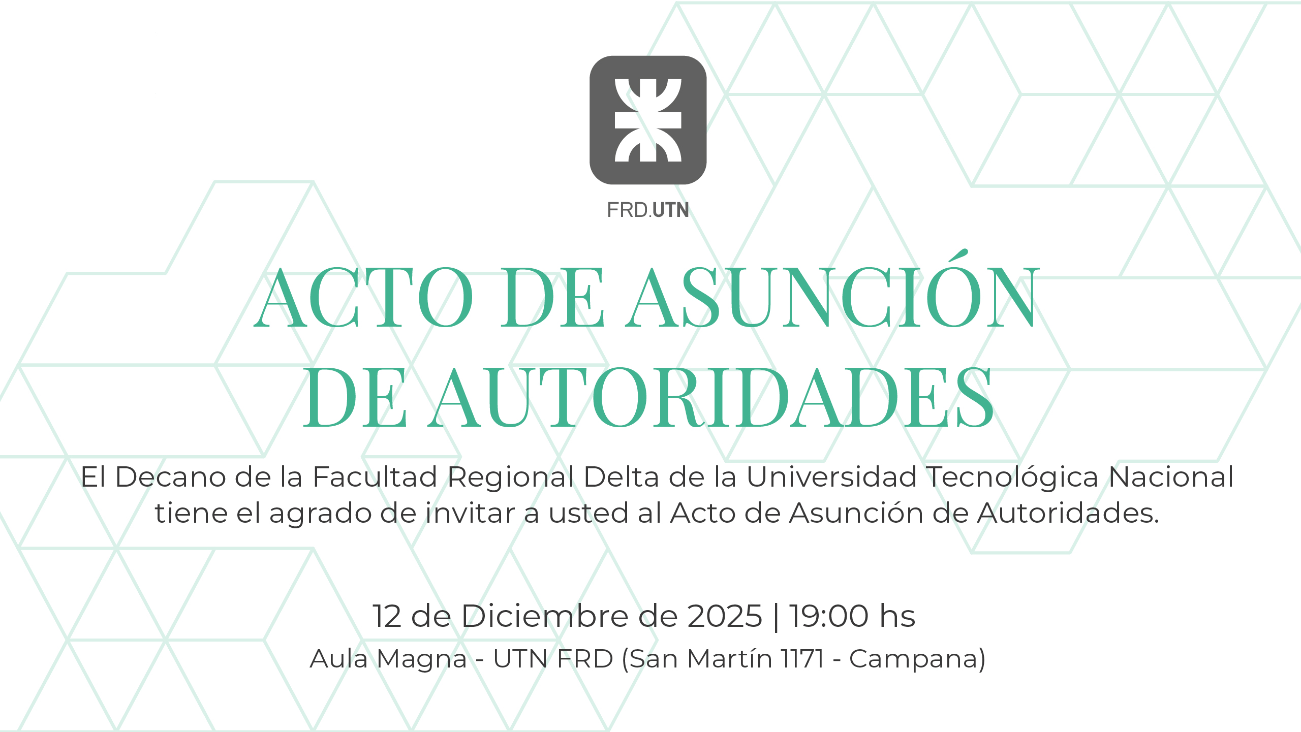 La Universidad Tecnológica Nacional – Facultad Regional Delta tiene el agrado de invitarles al Acto de Asunción de Autoridades electas para el período 2025-2029, un momento significativo para nuestra comunidad académica. Fecha: Viernes 12/12 Lugar: Aula Magna – UTN Facultad Regional Delta En esta ceremonia asumirán sus funciones el Decano, la Vicedecana y los Directores […]