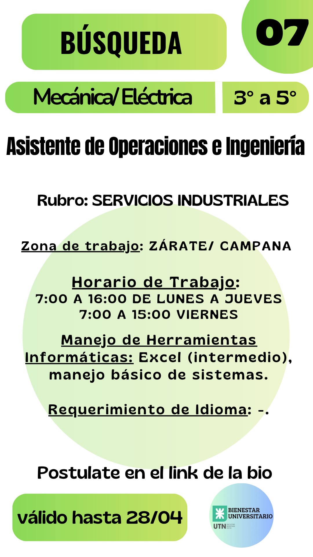 | Capacitación a recibir: Formación en gestión operativa de servicios industriales, seguimiento de obras, uso de sistemas de gestión (Persat) y soporte técnico en campo |