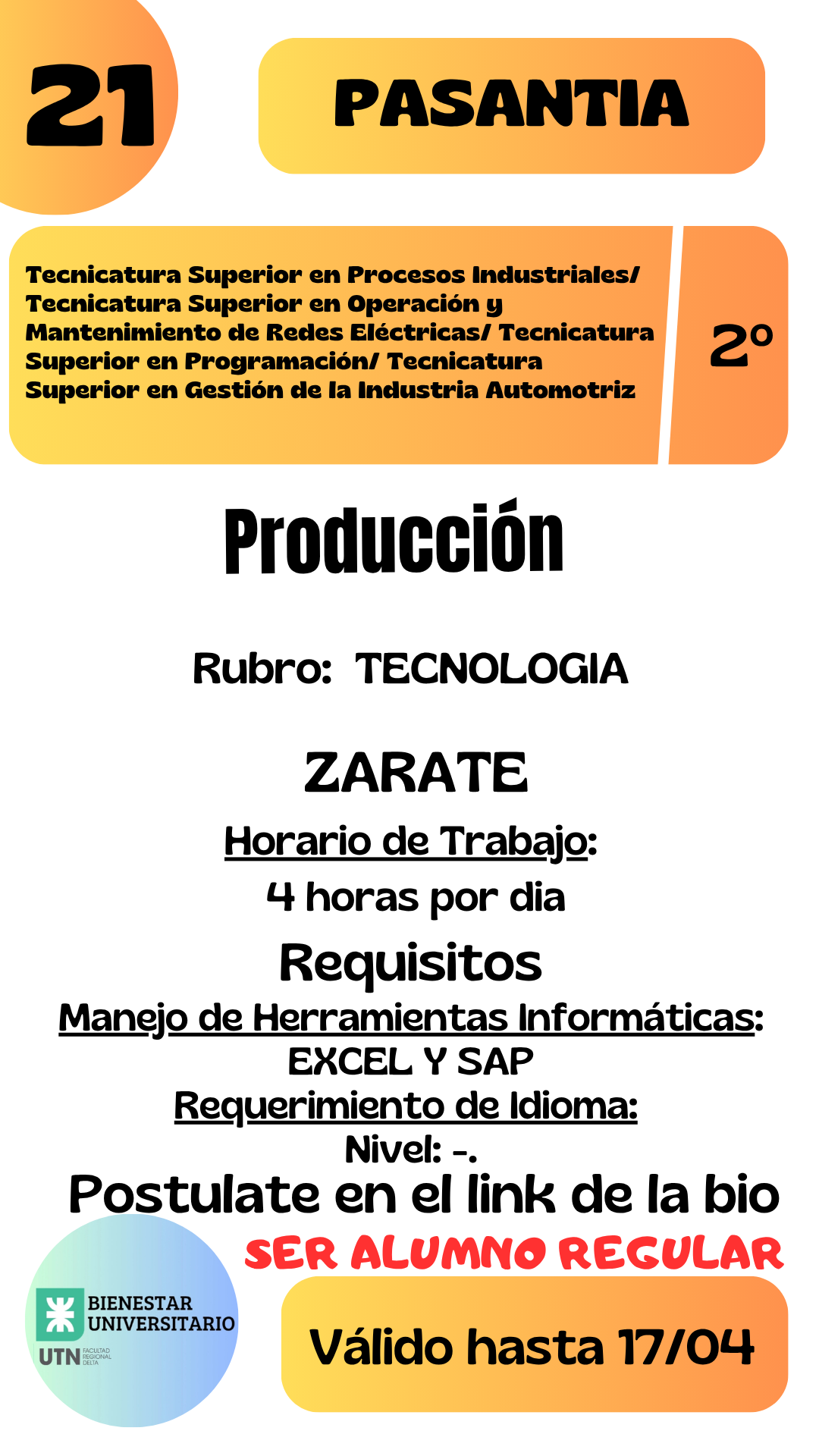Tecnicatura Superior en Procesos Industriales/ Tecnicatura Superior en Operación y Mantenimiento de Redes Eléctricas/ Tecnicatura Superior en Programación/ Tecnicatura Superior en Gestión de la Industria Automotriz