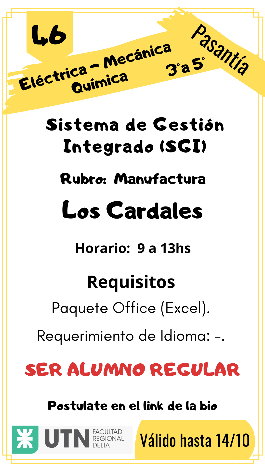 Tareas a desarrollar: –Gestión de Loyal (incluye capacitaciones para ingresos, refuerzos, charlas, etc). –Capacitación SGI ingresantes –Reunión y seguimiento de documentación de las áreas y avances de publicaciones. –Asistencia a personas para subir documentos, revisar, etc. –Seguimiento y actualización de objetivos, indicadores y planes sectoriales. –Asistencia y planificación de auditorías de gestión y 5S. –Soporte 5S a las áreas. –Bajada mensual de las y seguimientos de AC (acciones correctivas). –Seguimiento de documentación de las áreas y avances de publicaciones. |