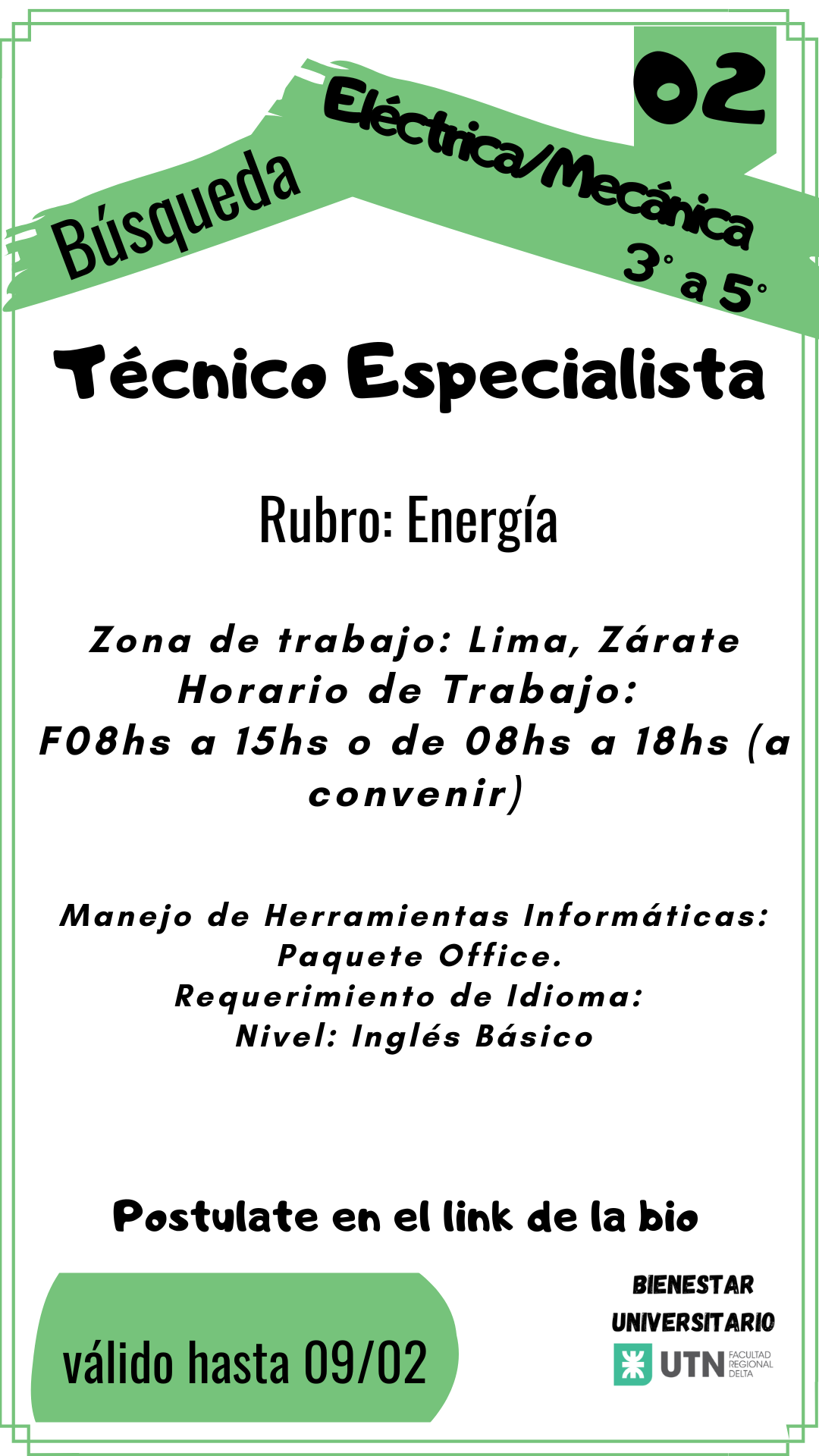 | Conocimientos : Se requieren conocimientos de vibraciones mecánicas (no excluyente) análisis e interpretación de datos, capacidad de interpretación de planos mecánicos y eléctricos, además de las aptitudes de iniciativa, trabajo en equipo, predisposición en capacitarse y compromiso. Es requisito saber interpretar manuales y normas en idioma inglés. |